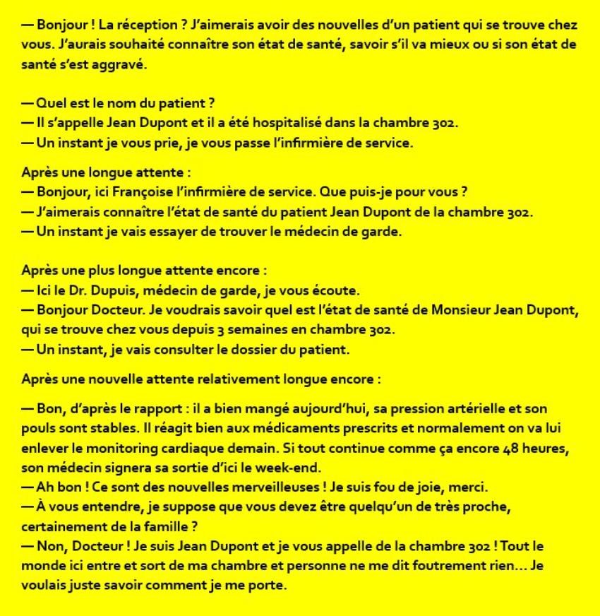 J'imaginais que c'était l'épouse pour savoir combien de temps elle pouvait passer avec son amant avant le retour de l'hôpital de son mari 😂. Mais, la chute là, est plus drôle !!